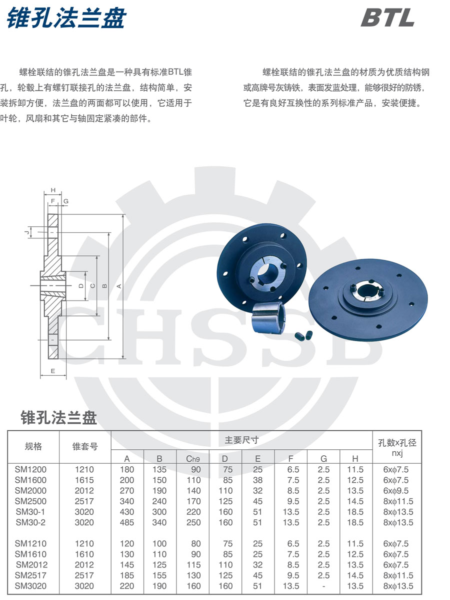螺栓聯結的錐孔法蘭盤是一種具有標準BTL錐孔,輪轂上有螺釘聯接孔的法蘭盤,結構簡單,安裝拆卸方便,法蘭